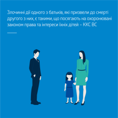 Системний аналіз положень Конвенції про права дитини, Закону України «Про охорону дитинства», Сімейного, Цивільного та Кримінального процесуального кодексів дає змогу зробити висновок, що злочинні дії одного з батьків стосовно іншого, які призвели до смерті потерпілого, є такими, що посягають на охоронювані законом права та інтереси їхніх дітей, а саме на право на батьківське піклування, на повноцінний фізичний, духовний, інтелектуальний, культурний та соціальний розвиток.