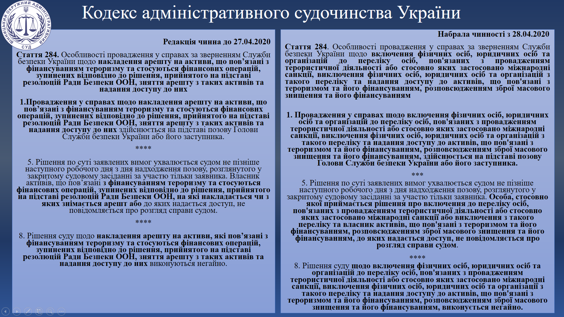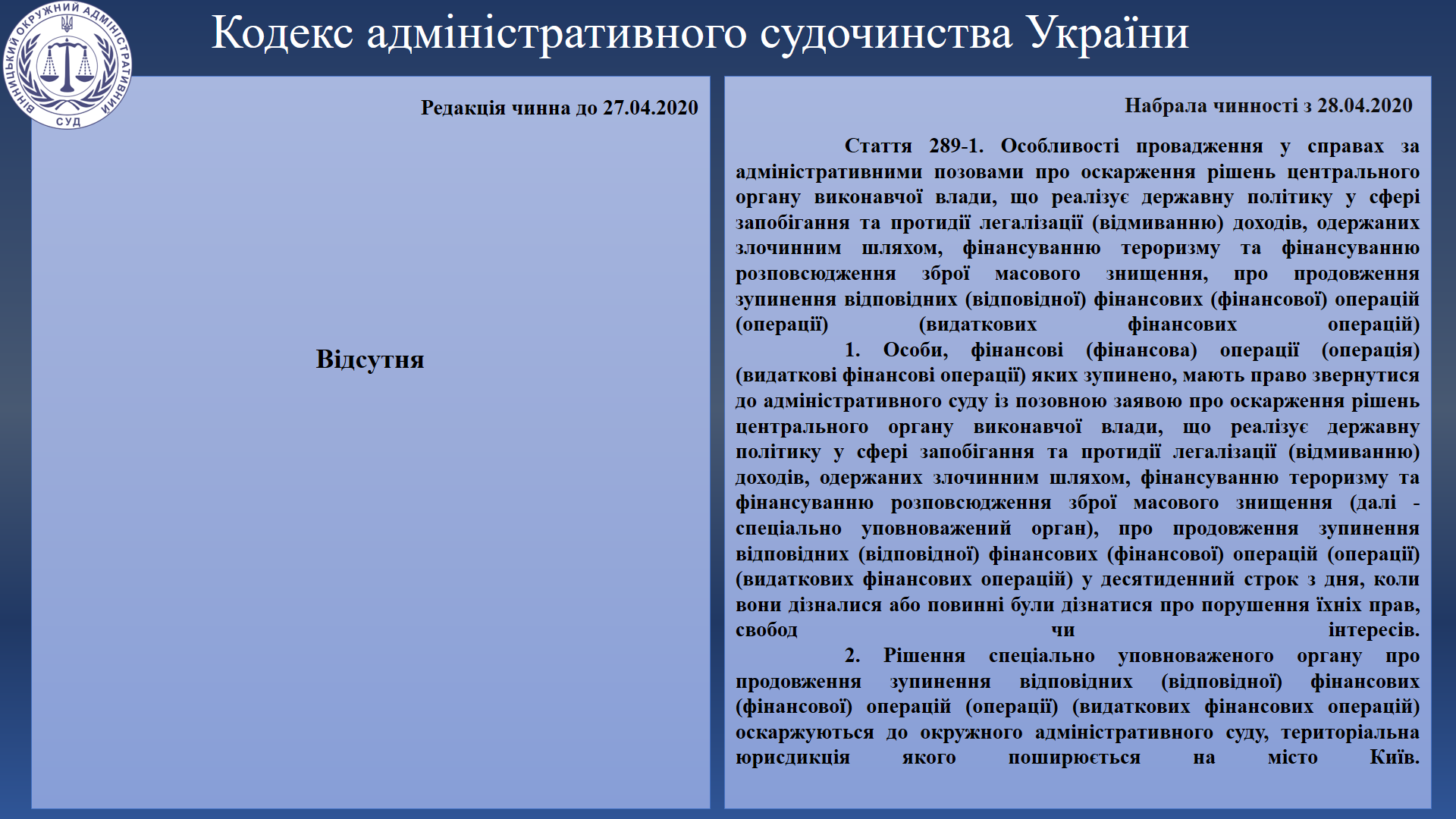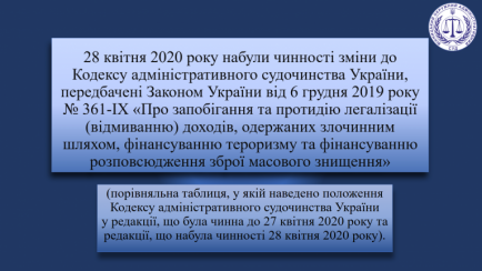28 квітня 2020 року набули чинності зміни до Кодексу адміністративного судочинства України, передбачені Законом України від 6 грудня 2019 року № 361-ІХ «Про запобігання та протидію легалізації (відмиванню) доходів, одержаних злочинним шляхом, фінансуванню тероризму та фінансуванню розповсюдження зброї масового знищення» (Закон).