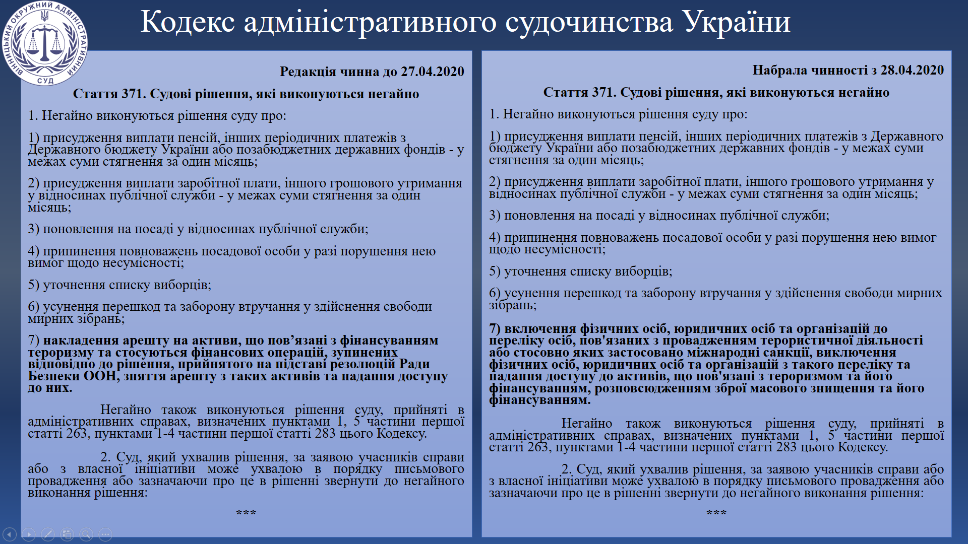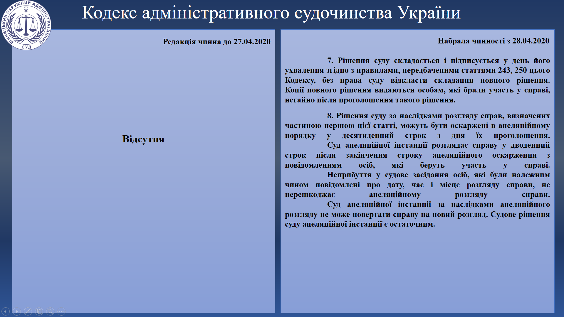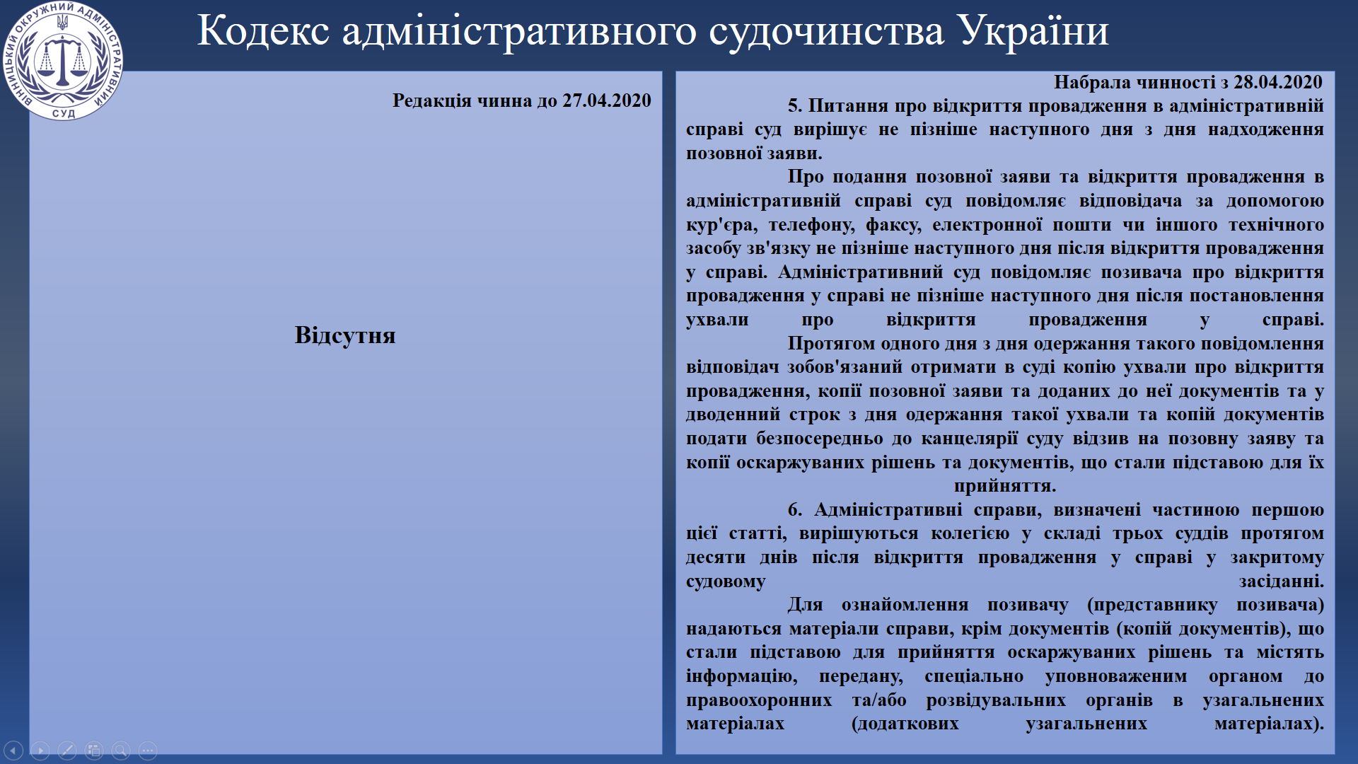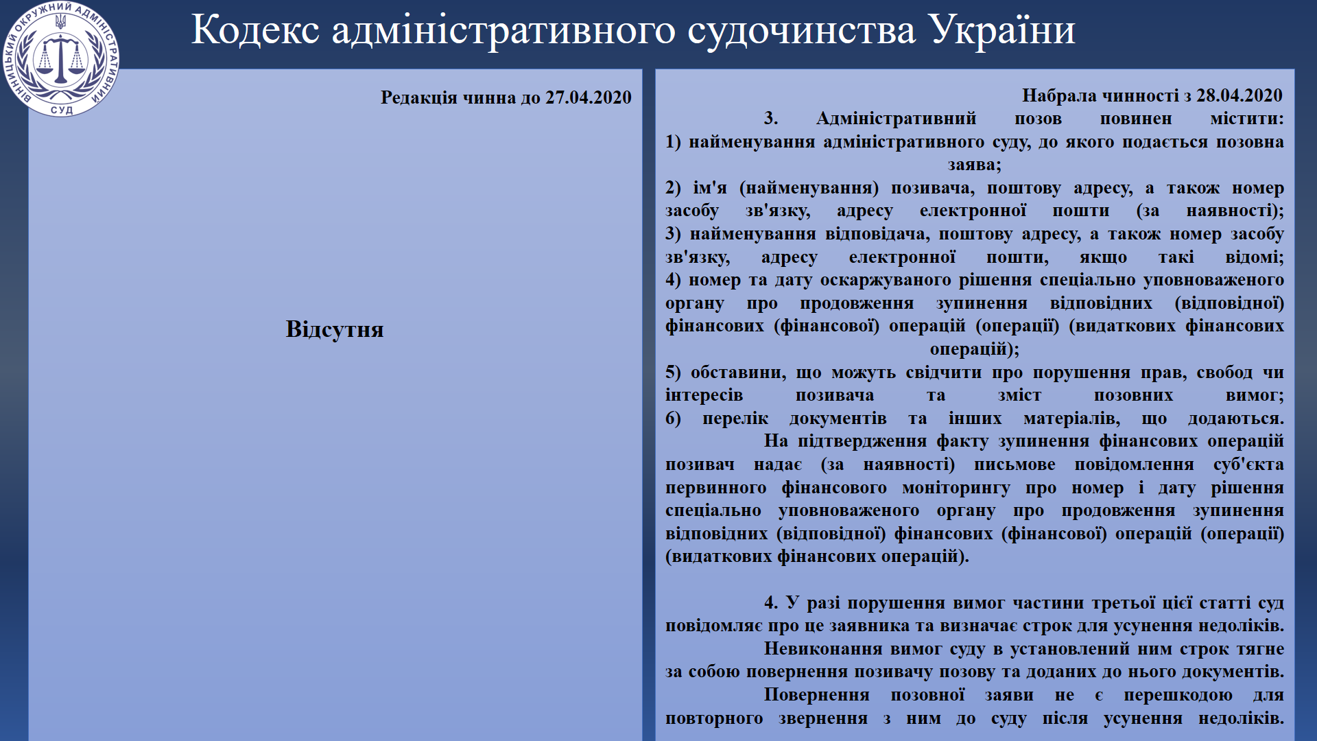 Для кращого розуміння змін, що передбачені Законом, Вінницький окружний адміністративний суд пропонує Вам ознайомитися з порівняльною таблицею, у якій наведено положення Кодексу адміністративного судочинства у редакції, що була чинна до 27 квітня 2020 року та редакції, що набула чинності 28 квітня 2020 року.