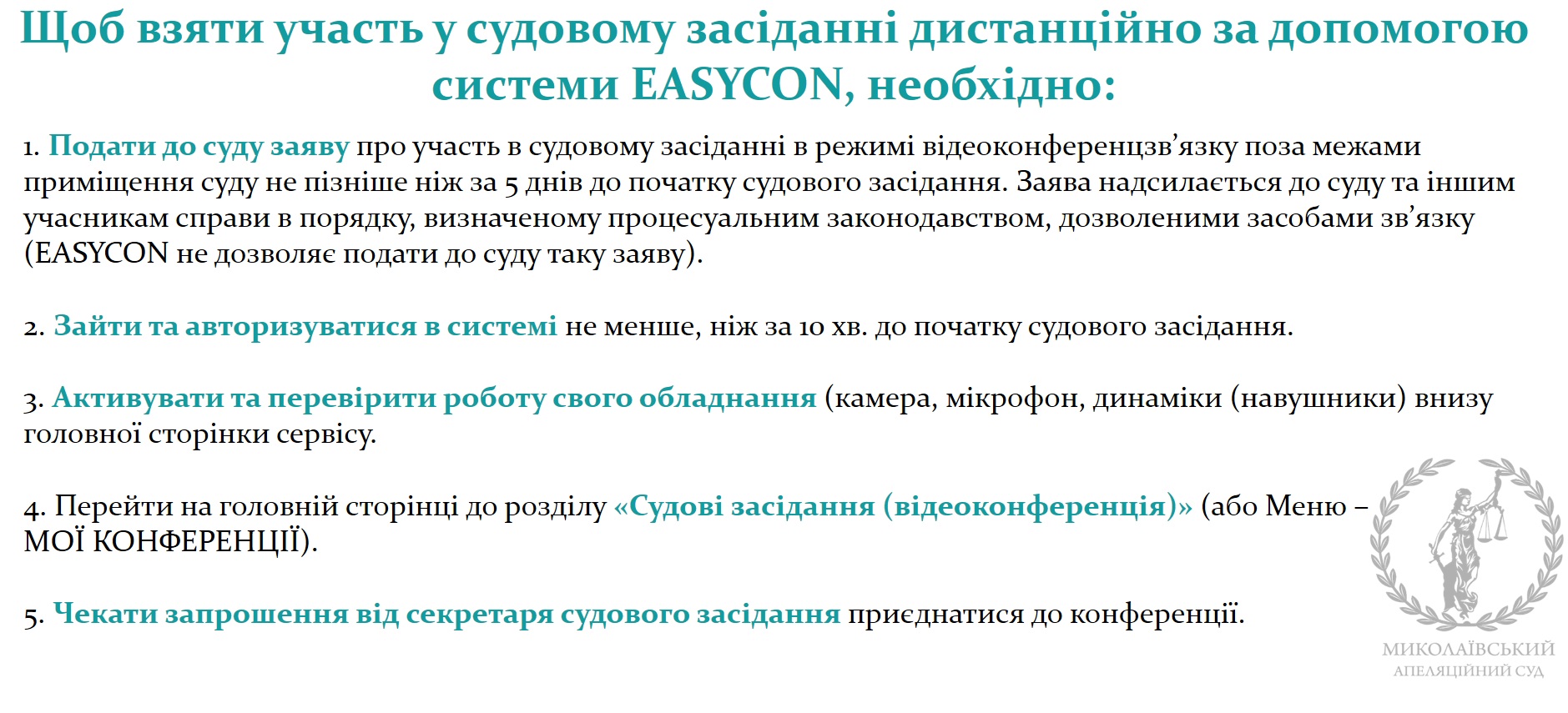Відповідно до затвердженого Порядку суди мають змогу використовувати як систему відеоконференцзв'язку Easycon, так і інші доступні суду та учасникам судового процесу засоби, що забезпечують проведення судових засідань в режимі відеоконференцзв’язку та відповідають вимогам законодавства.