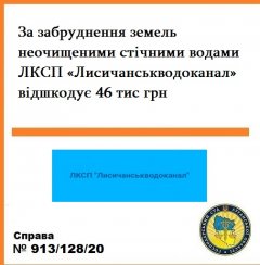 Так, в ході планової перевірки комунального спеціалізованого підприємства, що проводилася обласною Держекоінспекцією в квітні-травні 2019 року, було встановлено скид і забруднення Лисичанськводоканалом земельної ділянки площею 250 кв.м. неочищеними стічними водами.