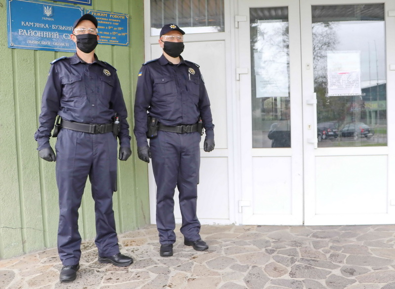 Усі співробітники Служби судової охорони несуть службу в захисних масках, рукавичках та окулярах. Що дві години в обов’язковому порядку проводиться дезінфекція робочих місць.
