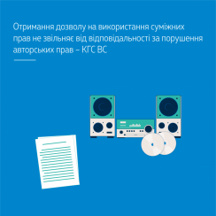 Отримання дозволу на використання суміжних прав не є підставою для звільнення від відповідальності за порушення авторських прав, оскільки при публічному виконанні музики в публічному закладі за допомогою будь-яких пристроїв і процесів має місце одночасне використання декількох об’єктів прав, у цьому випадку, зокрема: об’єктів авторського права – музичних творів з текстом (ст. 8 Закону України «Про авторське право і суміжні права»); об’єктів суміжних прав – виконань музичних творів, фонограм із записом виконань музичних творів (ст. 35 зазначеного Закону). При цьому авторські права не можуть «поглинатися» суміжними правами, як і суміжні права не «поглинаються» авторськими правами. Правомірне використання об’єктів суміжних прав не звільняє користувача від обов’язку врегулювати з автором чи з іншим суб’єктом авторського права питання використання об’єктів авторських прав шляхом отримання відповідної згоди, сплати винагороди за використання саме об’єктів авторського права.