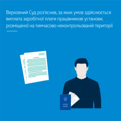 Суд вказав, що постановою Кабінету Міністрів України від 7 листопада 2014 року № 595 затверджено Тимчасовий порядок фінансування бюджетних установ, здійснення соціальних виплат населенню та надання фінансової підтримки окремим підприємствам і організаціям Донецької та Луганської областей, відповідно до п. 3 якого заробітна плата (грошове забезпечення, суддівська винагорода) працівникам (військовослужбовцям, особам рядового і начальницького складу) установи за період, коли установа розміщувалася на тимчасово неконтрольованій території, а у подальшому територія була повернута під контроль органів державної влади, або установа була переміщена в населений пункт, на території якого органи державної влади здійснюють свої повноваження в повному обсязі (далі – контрольована територія), виплачується у повному обсязі за рахунок кошторису (плану використання бюджетних коштів) установи.