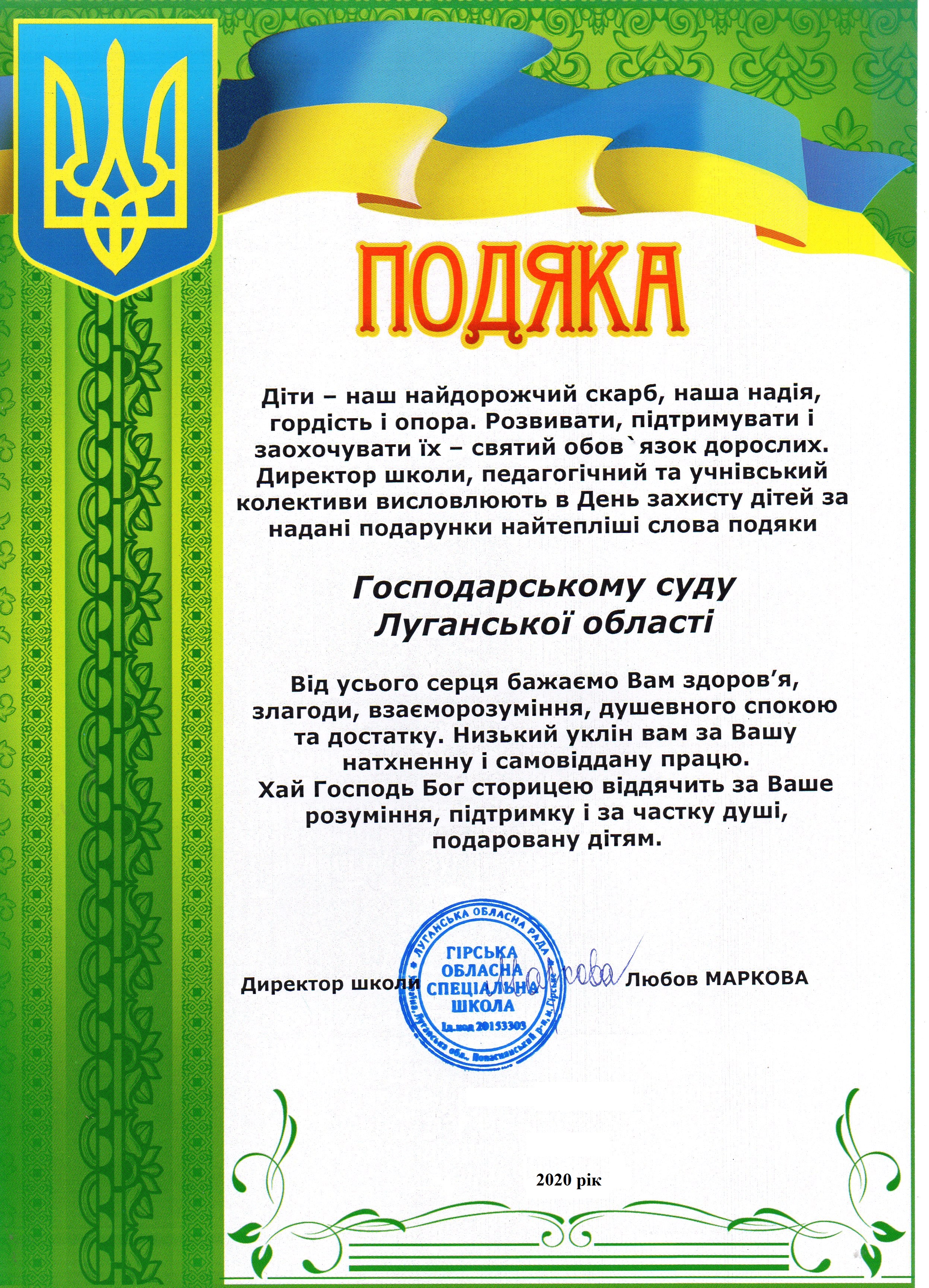 Напередодні Міжнародного дня захисту дітей колектив Господарського суду Луганської області передав вихованцям Гірської обласної спеціальної школи подарунки, а саме: набори, матеріали та інструменти для дитячої творчості.