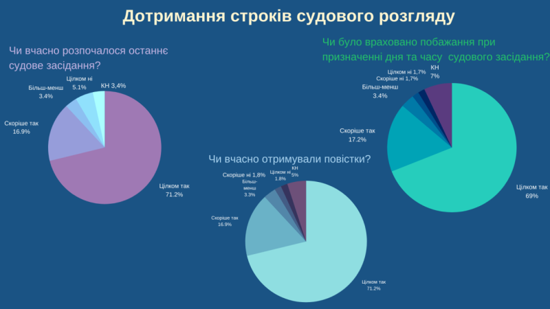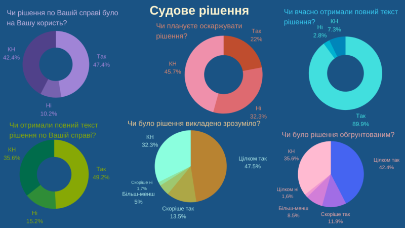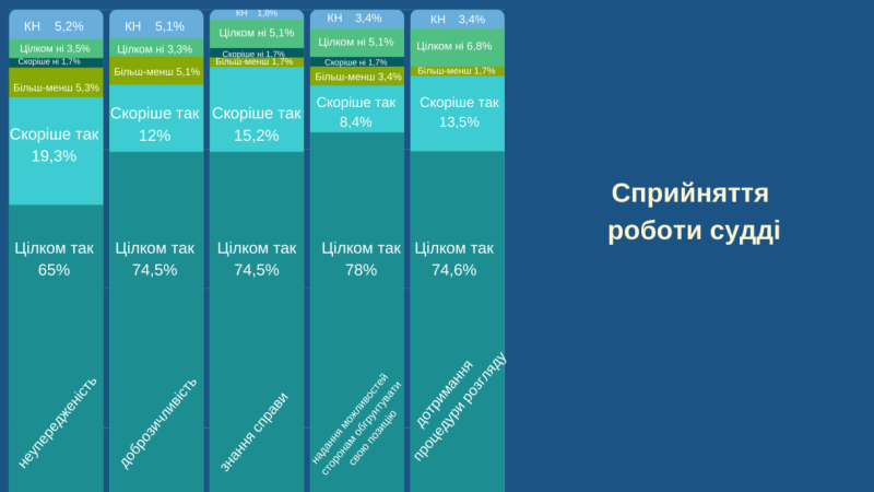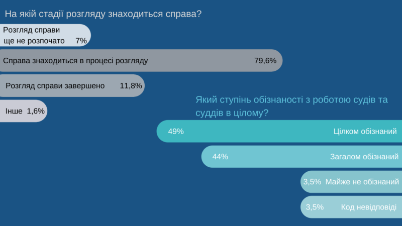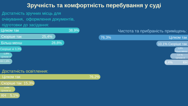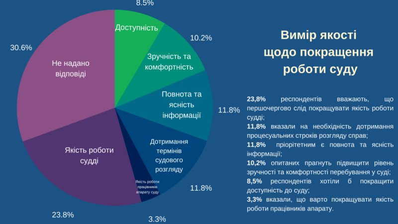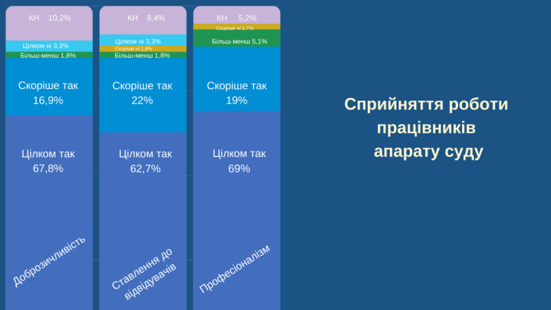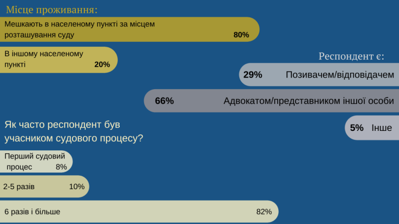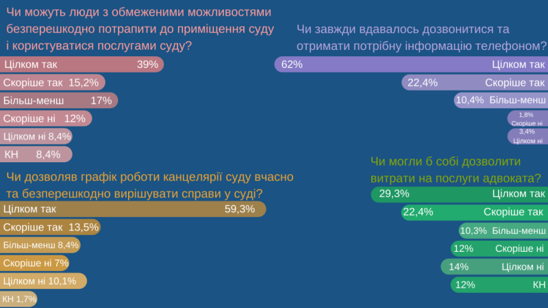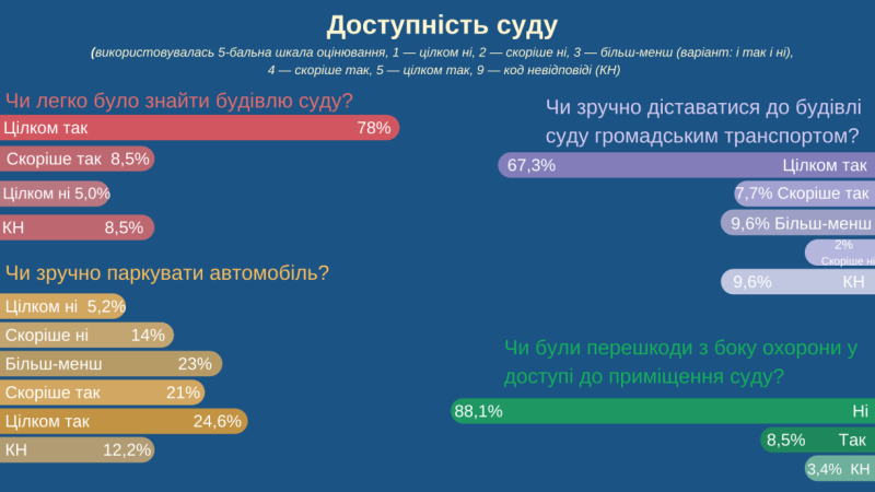 У ході реалізації опитування зібрана та проаналізована інформація за зазначеними вище параметрами, а результат опитування відвідувачів щодо якості функціонування суду відображений у відсотковому значенні відповідно до кількості респондентів, що надали відповідь на те чи інше питання в анкеті. Всього в опитуванні прийняло участь 59 осіб.