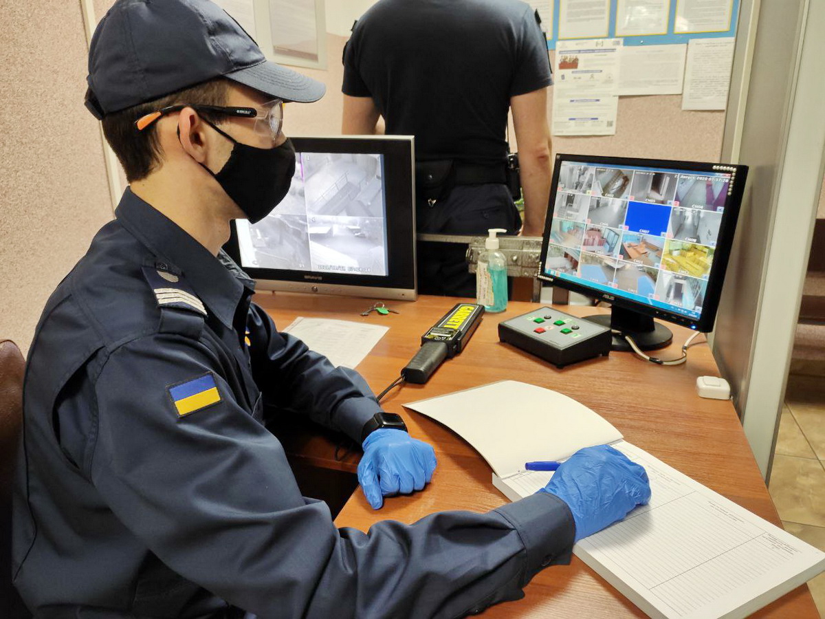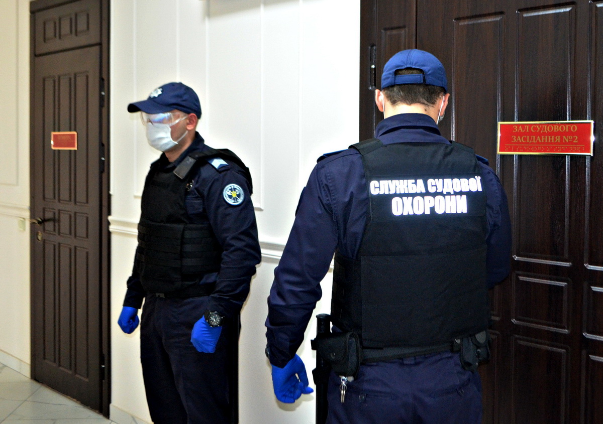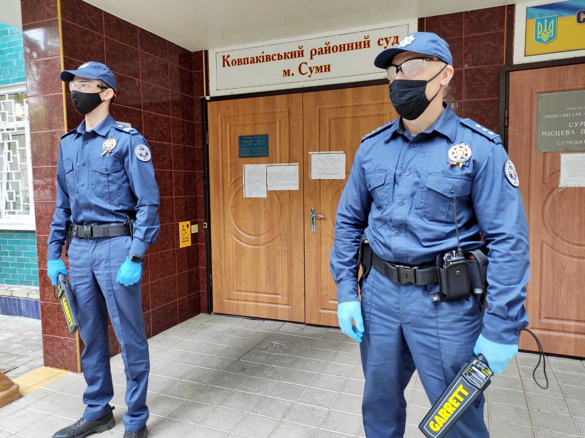 Судові охоронці несуть службу в захисних масках, окулярах і рукавичках, а кожний пункт пропуску до судової установи забезпечений засобами для дезінфекції рук та предметів.