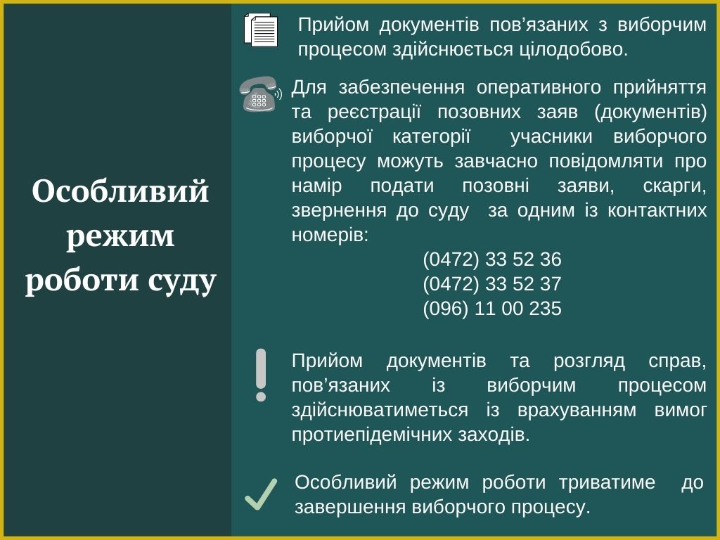 Такий розпорядок запроваджено у зв’язку з початком з 5 вересня 2020 року виборчого процесу чергових місцевих виборів, призначених на 25 жовтня 2020 року, для забезпечення організації роботи суду щодо приймання і розгляду позовних заяв, скарг, заяв в адміністративних справах, пов’язаних з виборчим процесом, у строки, установлені Кодексом адміністративного судочинства України.