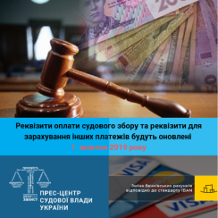 Повідомляємо Вас, що в зв’язку з прийнятими змінами, реквізити оплати судового збору та реквізити для зарахування інших платежів, що розміщені на веб-сайті суду та на стендах в приміщенні суду, будуть оновлені 1 жовтня 2019 року.