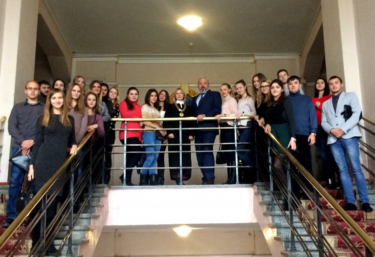Голова суду Усатий Віталій Олександрович розповів присутнім, які справи розглядаються господарським судом та про діяльність суду. Пояснив, що судові засідання у суді є відкритими, крім випадків, установлених законом. Розповів студентам про посаду голови суду, керівника апарату суду та побажав студентам успіхів у навчанні.