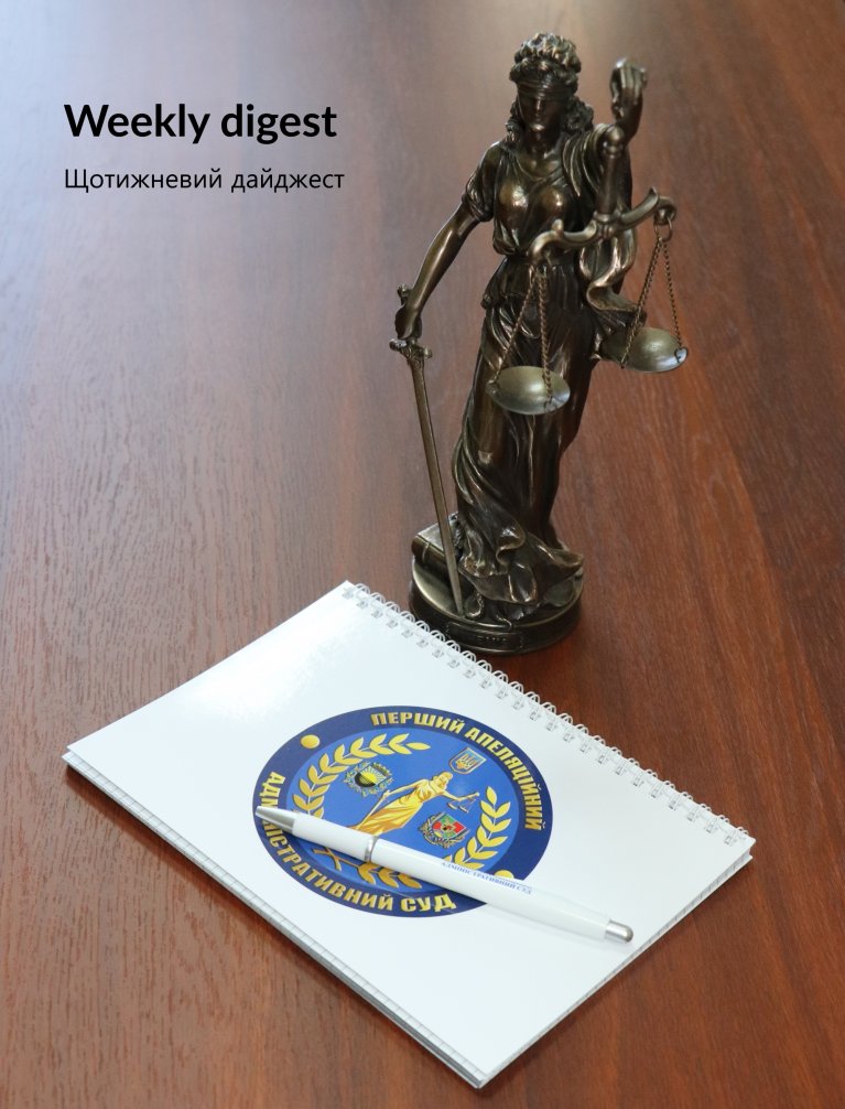 За поточний тиждень суддями Першого апеляційного адміністративного суду розглянуто 35 справ, які здебільшого стосувалась податкових та соціальних спорів, зокрема перерахунку пенсії та призначення пенсії за віком. Мають місце також справи з приводу прийняття та звільнення громадян з публічної служби.