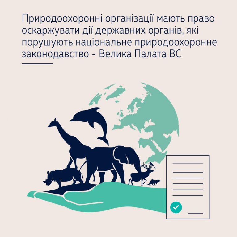 Велика Палата Верховного Суду у постанові від 11 грудня 2018 року в справі № 910/8122/17 дійшла висновку, що природоохоронна організація (благодійна, громадська) має право на представництво в суді екологічних інтересів суспільства й окремих його членів з метою захисту порушених екологічних прав людини та громадянина або з метою усунення порушень вимог екологічного законодавства.