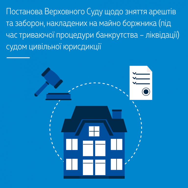 Верховний Суд у складі судової палати для розгляду справ про банкрутство Касаційного господарського суду розглянув питання застосування приписів статті 23 Закону України «Про відновлення платоспроможності боржника або визнання його банкрутом» (в редакції Закону України № 2343-ХІІ від 14 травня 1992 року, до набрання чинності з 19 січня 2013 року змін, внесених Законом України від 22 грудня 2011 року № 4212-VI) щодо зняття арештів та заборон, накладених на майно боржника (під час триваючої процедури банкрутства – ліквідації) судом цивільної юрисдикції в межах розгляду цивільної справи.