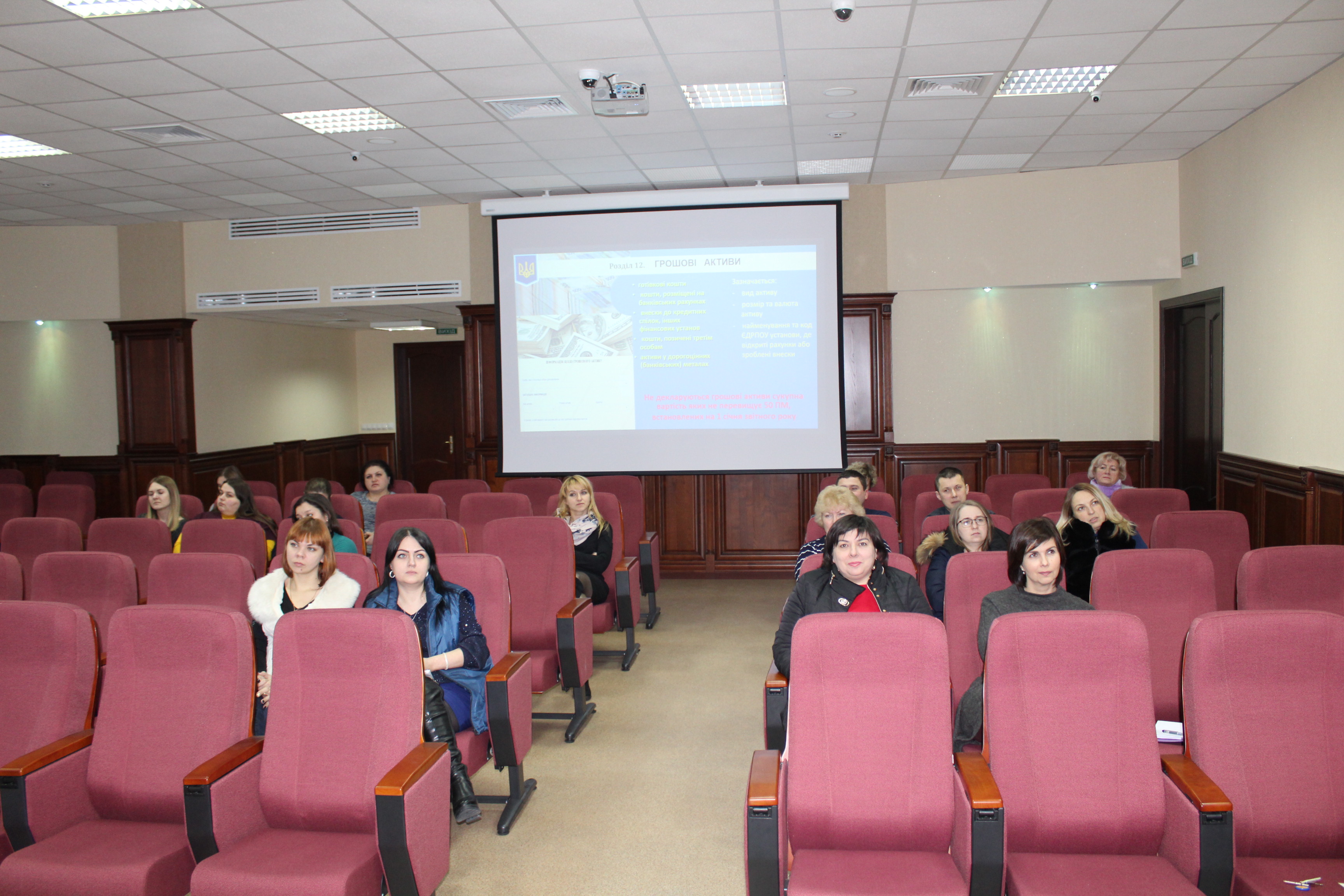Заступник керівника апарату суду Крістіна Слободонюк, головний спеціаліст сектору з кадрового забезпечення та з питань управління персоналом Ліля Войціхова та прес-секретар суду Людмила Гнатовська у формі слайдової презентації розповіли присутнім державним службовцям про актуальні питання застосування антикорупційного законодавства щодо дотримання вимог фінансового контролю та про загальні правила подання державними службовцями декларацій за 2018 рік.