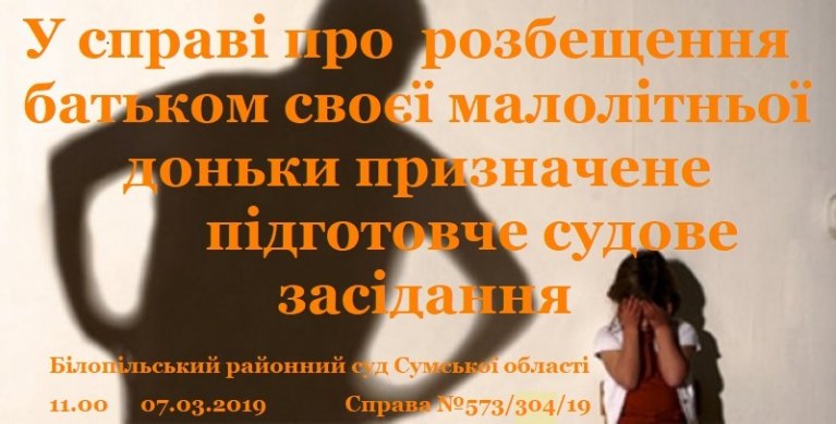 На 11:00 годину 7 березня 2019 року призначене підготовче судове засідання у справі стосовно громадянина Н., обвинуваченого за частиною 2 статті 156 КК України (вчинення розпусних дій щодо особи, яка не досягла шістнадцятирічного віку, вчинені щодо малолітньої батьком), та за частиною першою статті 122 КК України (умисне середньої тяжкості тілесне ушкодження, тобто умисне ушкодження, яке не є небезпечним для життя і не потягло за собою наслідків, передбачених у статті 121 КК України, але таке, що спричинило тривалий розлад здоров’я).