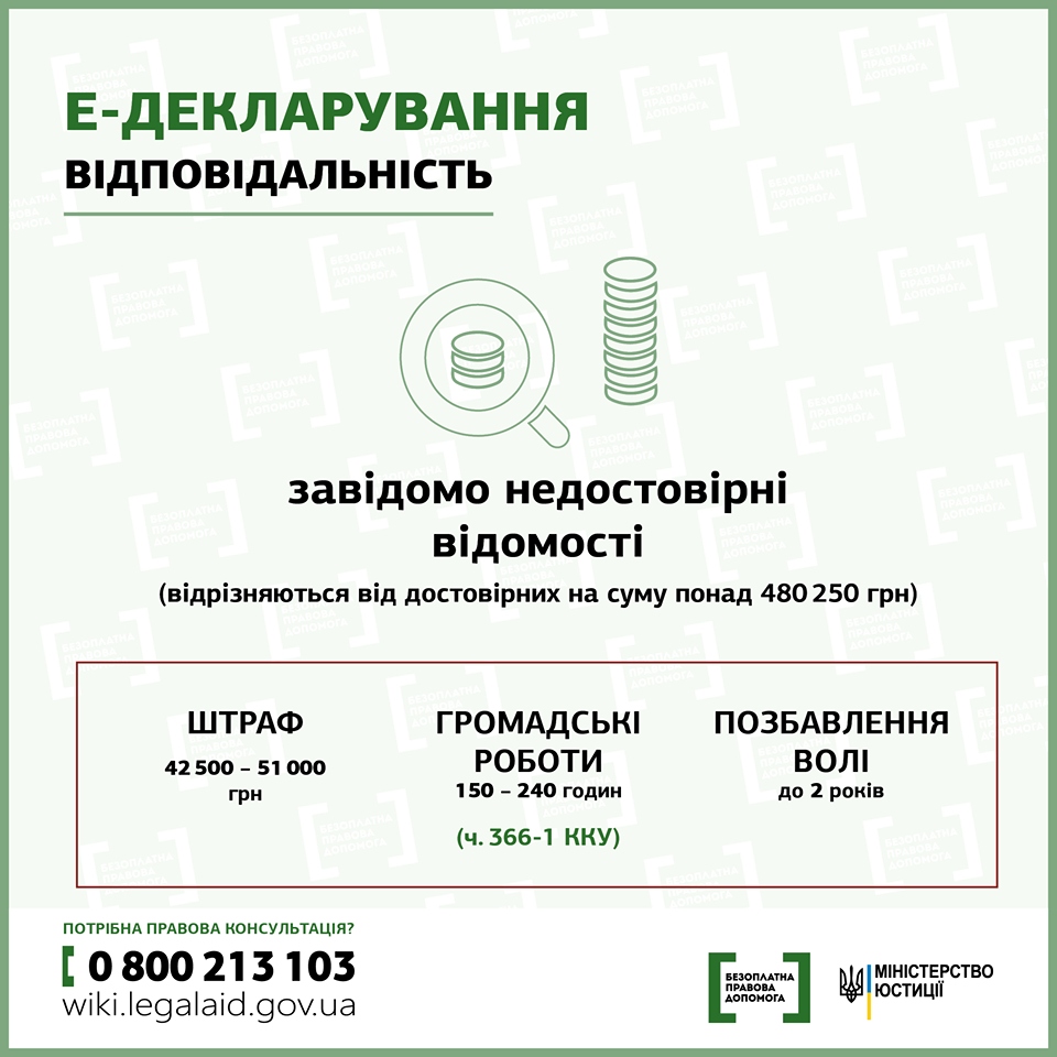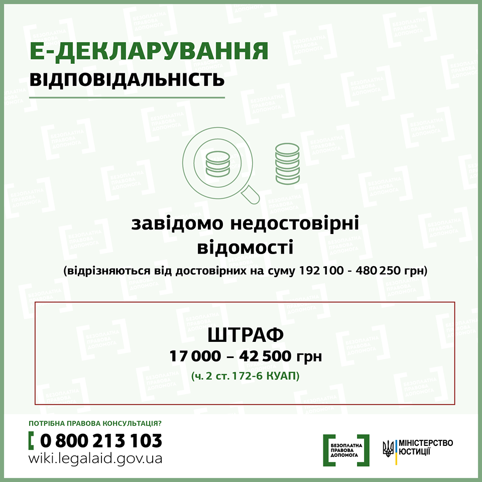 Звертаємо увагу на те, що порушення вимог фінансового контролю, умисне недекларування або декларування недостовірної інформації є корупційними правопорушеннями, за які передбачено адміністративну (стаття 172-6 Кодексу України про адміністративні правопорушення) та кримінальну (стаття 366-1 Кримінального кодексу України) відповідальність.