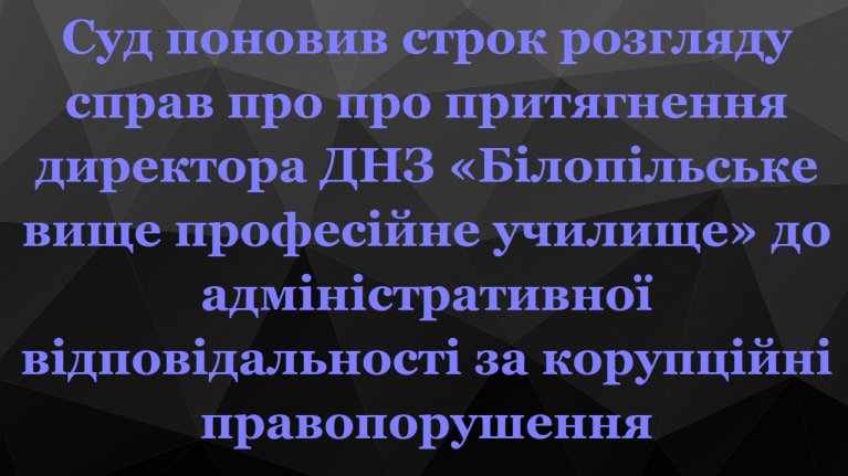 Постановами суду від 4 березня 2019 року поновлено строк розгляду справ про притягнення директора ДНЗ «Білопільське вище професійне училище» до адміністративної відповідальності за корупційні правопорушення, передбачені частинами 1, 2 статті 172-7 Кодексу України про адміністративні правопорушення.
