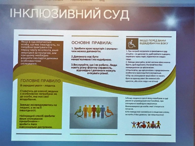 Перший блок тренінга містив питання щодо загальних понять про людей з інвалідністю та їхній правовий статус, а також про доступ до правосуддя як суспільне благо; інклюзію; етику спілкування – навички для працівника суду.