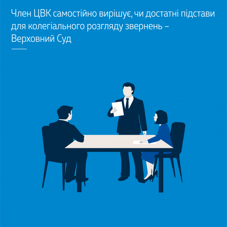 У цьому зв’язку суд зазначив, що розгляд звернень у ЦВК організовано таким чином, що попереднє їх вивчення здійснює член ЦВК, до повноважень якого віднесено, з-поміж іншого, вирішувати, чи є достатні підстави для того, щоб порушені у зверненні питання Комісія розглядала на засіданні та ухвалювала з цього приводу колегіальне рішення (частини 5, 6, 7 ст. 15 Закону України «Про Центральну виборчу комісію» (№ 1932-IV), Регламент ЦВК)..