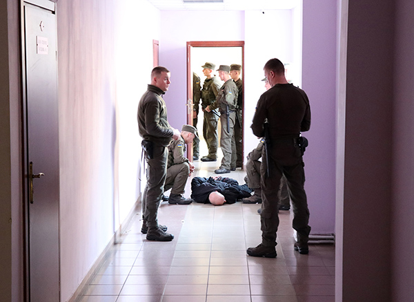 Після одного із судових засідань обвинувачених у скоєнні грабежу супроводжували військовослужбовці Національної гвардії України до конвойного приміщення.